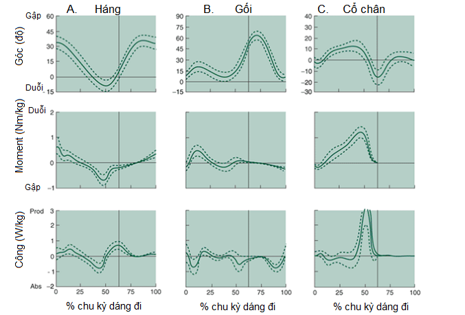 Hình 7-8. Dịch chuyển góc, moment lực, và công trong một nhịp bước đi. A. Háng, B. Gối, C. Cổ chân. Đường dọc đậm phân cách thì tựa và thì đu đưa.