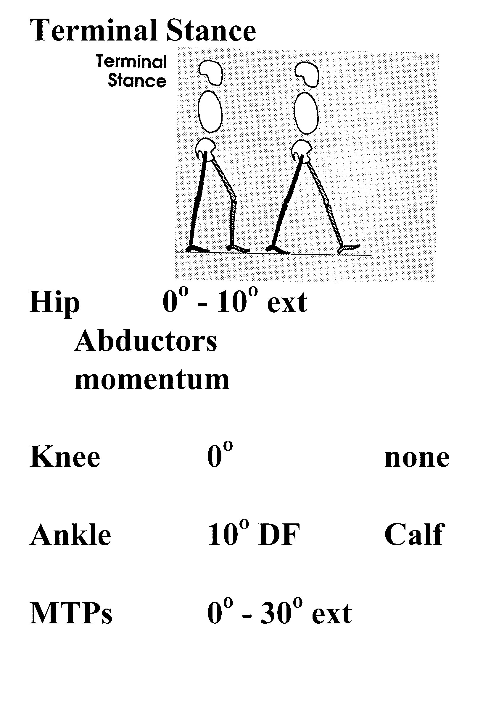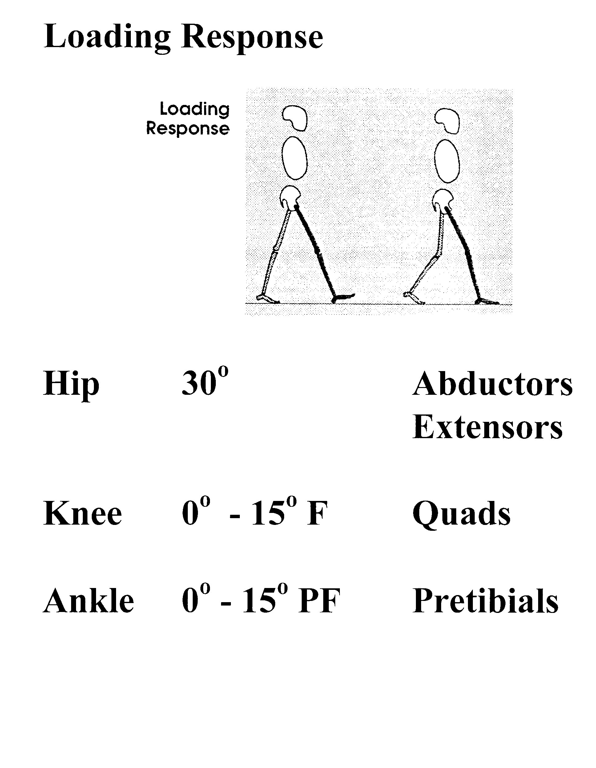 Các hình vẽ tóm tắt các giai đoạn của dáng đi kèm tầm vận động các khớp (háng, gối, cổ chân) bên trái và cơ hoạt động chính (bên phải)