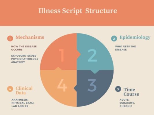 Để giải thích khả năng nhận dạng mẫu nhanh chóng (Hệ thống 1), các nhà nghiên cứu đã đề xuất khái niệm “kịch bản bệnh tật.” Đây là các cấu trúc kiến thức khái niệm được lưu trữ trong bộ nhớ dài hạn, đại diện cho các chuỗi sự kiện điển hình liên quan đến một căn bệnh. Một kịch bản bệnh tật được phát triển tốt bao gồm các thành phần cốt lõi sau: